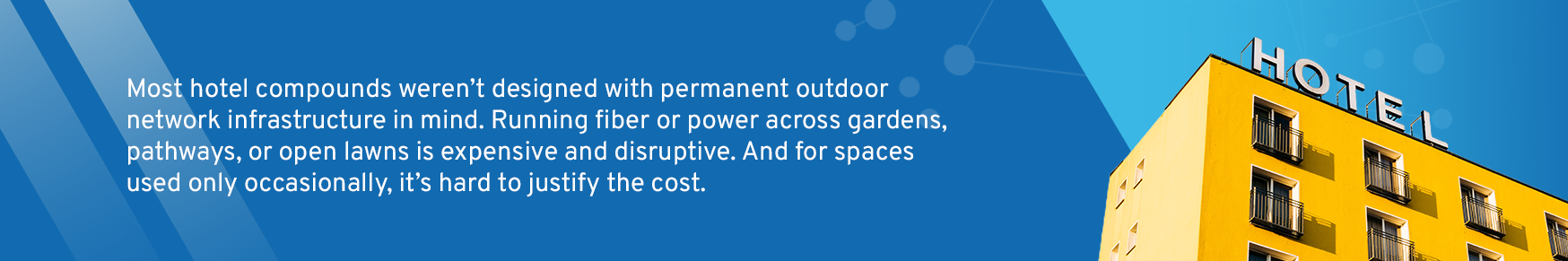 Most hotel compounds weren’t designed with permanent outdoor network infrastructure in mind. Running fiber or power across gardens, pathways, or open lawns is expensive and disruptive. And for spaces used only occasionally, it’s hard to justify the cost. So hotels improvise: